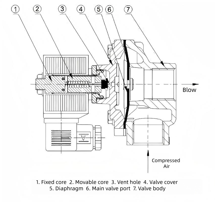 Keď elektrický signál z regulátora impulzného prúdu prestane, kotva elektromagnetického impulzného ventilu sa resetuje. Výfukový otvor zadnej komory sa zatvorí a tlak v zadnej komore sa zvýši, čo prinúti zostavu membrány tesne priliehať k výstupu ventilu. Elektromagnetický impulzný ventil sa vráti do „zatvoreného“ stavu.